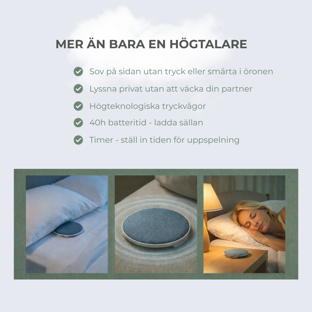 Vi förstår. Att somna kan vara svårare än det borde vara. Hörlurar känns obekväma. Att spela ljud högt stör din partner. Och att bara “försöka slappna av” räcker inte alltid.